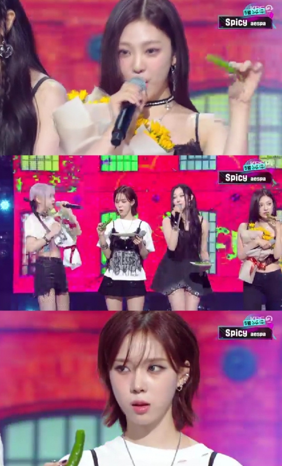 특히 에스파 멤버들은 앵콜 무대를 펼치며 매운 고추를 먹어 눈길을 끌었다. 에스파의 신곡 'Spicy'는 강렬한 신스 베이스 사운드와 다이내믹한 비트가 돋보이는 댄스곡으로, 손가락으로 매운 맛 소스를 찍어 먹는 모습을 표현한 포인트 안무는 물론, 발랄하고 활기찬 'Cool'함과 당당하고 화려한 'Hot'함 두 가지 매력이 돋보이는 퍼포먼스 역시 강한 중독성을 불러일으키며 뜨거운 반응을 얻고 있다.
