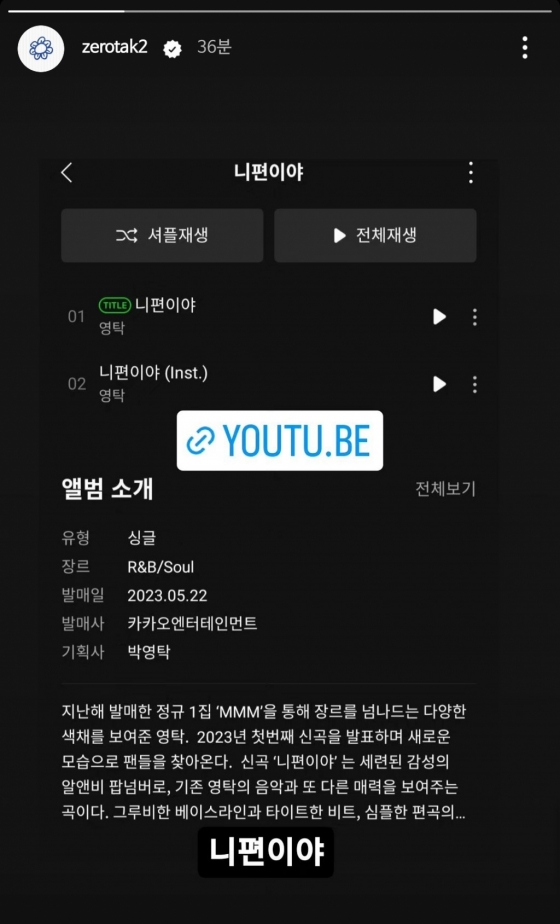 영탁은 22일 12시에 발매한 디지털 싱글앨범 콘세트 '니 편이야'의 앨범을 소개하는 멜론의 앨범 소개 사진과 유튜브 링크를 알리며 적극 홍보에 나섰다.