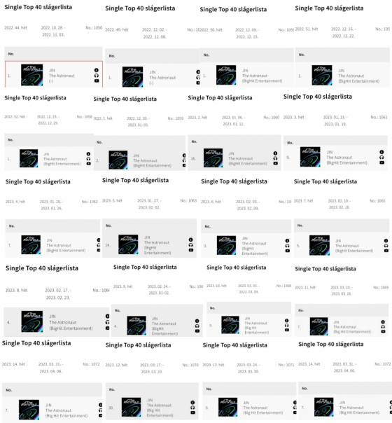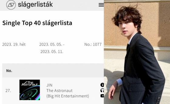 진의 첫 솔로 싱글 '디 애스트로넛'(The Astronaut)은 2023년 19주 차 헝가리 '싱글 톱 40 차트'(Hungary's Single Top 40 Chart/5월 5일~5월 11일)에 27위로 재진입했다.
