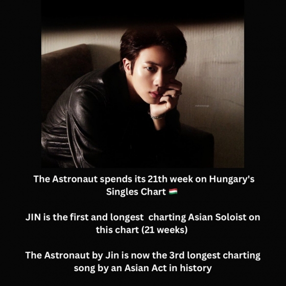 진의 '디 애스트로넛'은 발매와 동시에 헝가리 차트 1위에 오르며, 4주 연속 1위를 기록했다. 이는 아시아 솔로 최초이자 최장 연속 1위이다.
