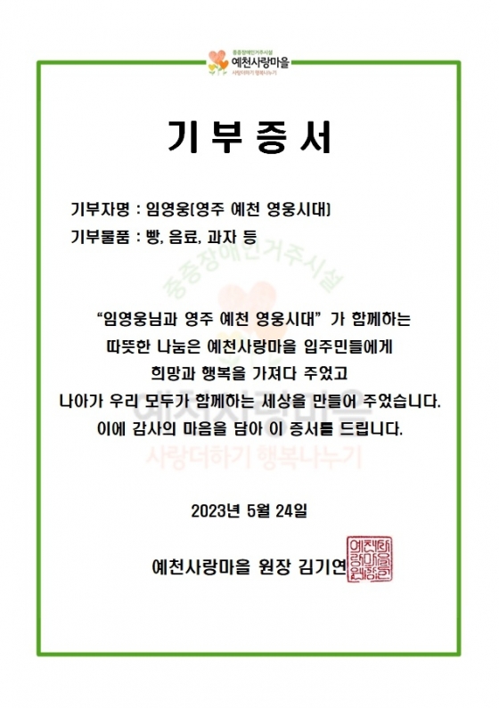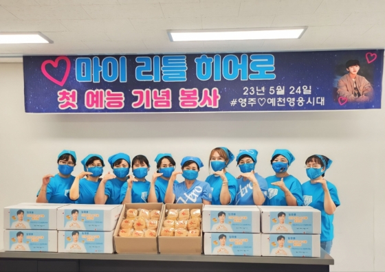 임영웅 팬클럽 영주 예천 영웅시대는 임영웅 첫 예능프로그램 '마이 리틀 히어로' 방송을 기념해 5월 24일 예천사랑마을과 영주종합사회복지관을 찾아 봉사하고 빵과 음료 등을 기부했다.