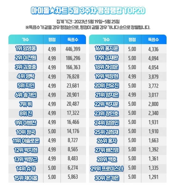 임영웅은 5월 19일부터 5월 25일까지 집계된 아이돌차트 5월 3주차 평점랭킹에서 44만 6399표를 얻어 1위를 차지했다.