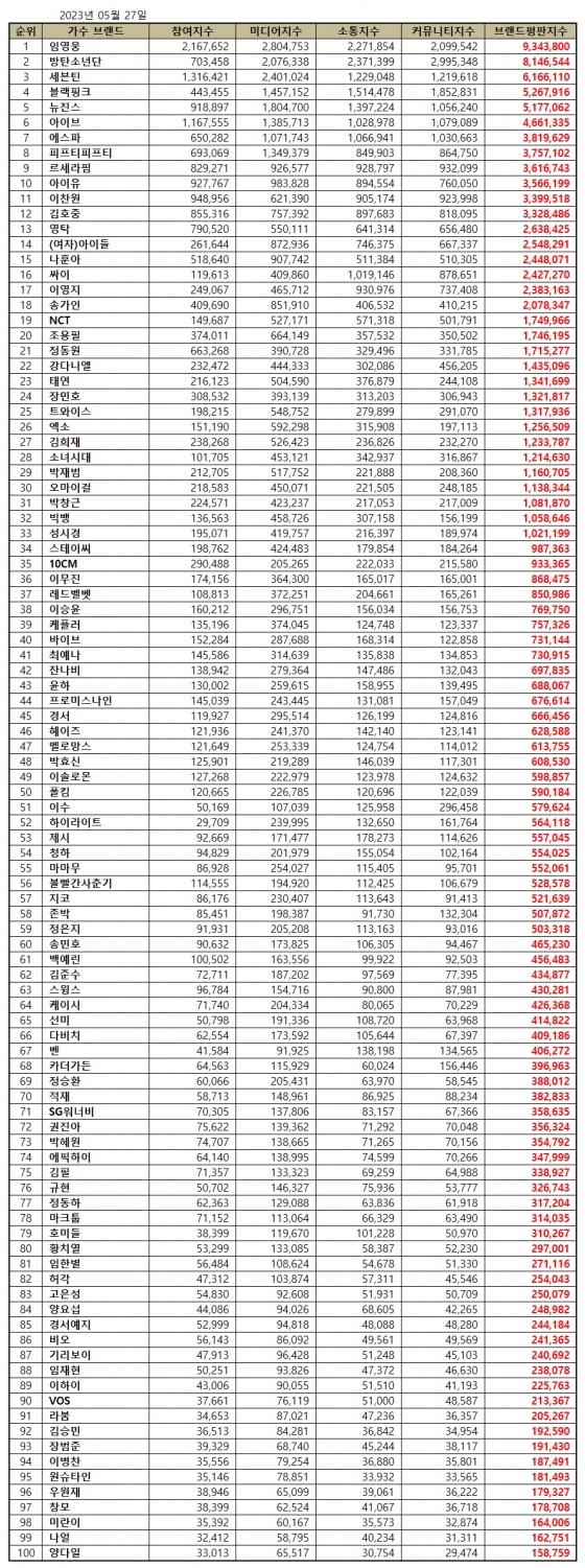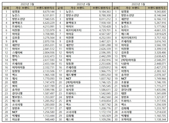 2023년 5월 가수 브랜드평판 30위 순위는 임영웅, 방탄소년단, 세븐틴, 블랙핑크, 뉴진스, 아이브, 에스파, 피프티피프티, 르세라핌, 아이유, 이찬원, 김호중, 영탁, (여자)아이들, 나훈아, 싸이, 이영지, 송가인, NCT, 조용필, 정동원, 강다니엘, 태연, 장민호, 트와이스, 엑소, 김희재, 소녀시대, 박재범, 오마이걸 순으로 분석됐다.