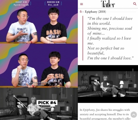 영국 매거진 태틀러(TATLER) 아시아판(홍콩·필리핀)에서도 'BTS Anniversary: 9 Inspirational Lyrics Even Non-BTS Fans Can Relate To'(BTS의 팬이 아닌 사람들도 공감할 수 있는 감동적인 가사 9곡)이란 제목의 글을 게재하며 위로와 힐링이 담긴 '에피파니'를 선정하며 "진은 에피파니에서 불안과 자신을 받아들이는 것에 대해 고군분투했다. 아름다운 편곡과 진의 부드러운 보컬, 그리고 깊은 감동을 주는 가사로 인해 이 곡은 전 세계 수많은 팬들이 좋아하는 노래"라고 전하기도 했다.