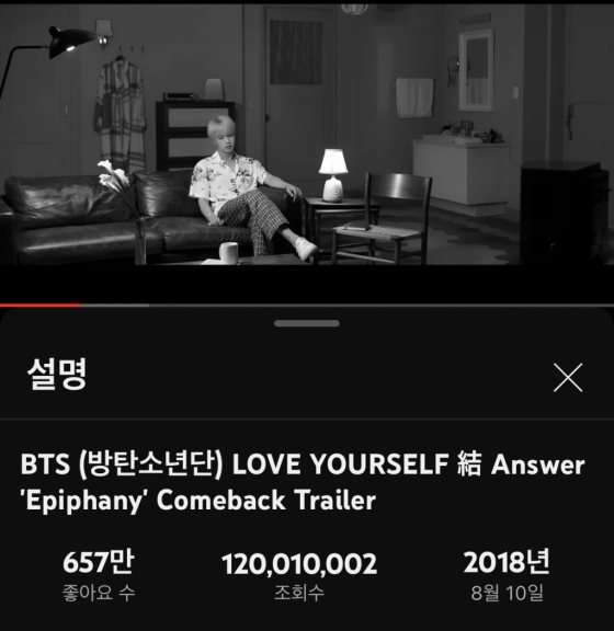 방탄소년단(BTS) 진의 솔로곡 '에피파니'(Epiphany) 뮤직비디오인 'BTS (방탄소년단) LOVE YOURSELF 結 Answer 'Epiphany' Comeback Trailer' 영상은 1억 2000만 뷰를 넘어서며 인기를 이어가고 있다.