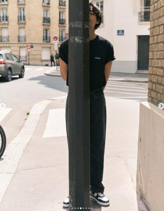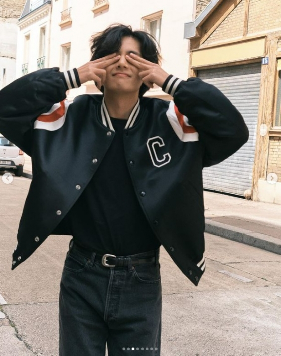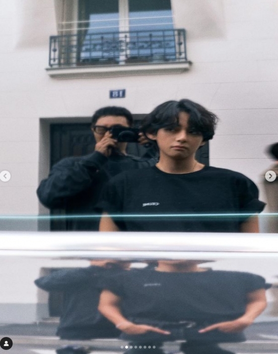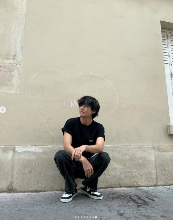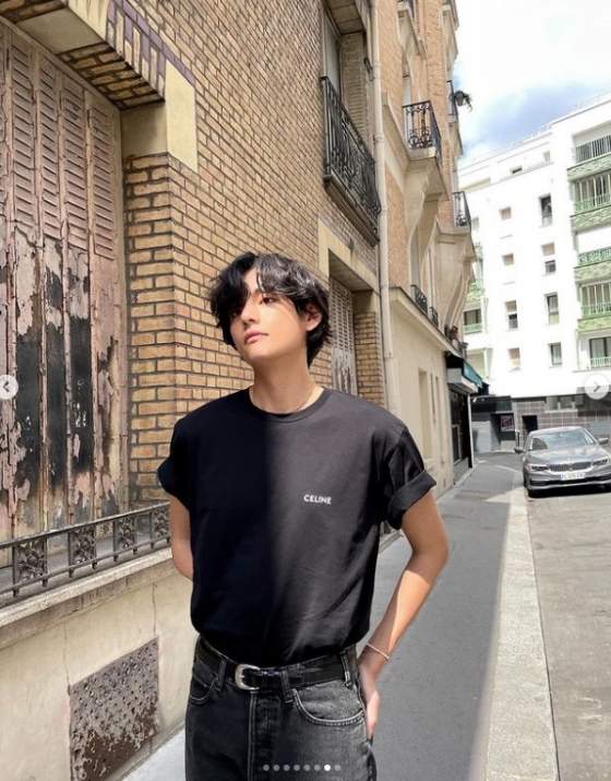 사진에는 뷔가 앰버서더로 활동 중인 브랜드의 옷을 입고 파리의 거리를 걷고 있었다.