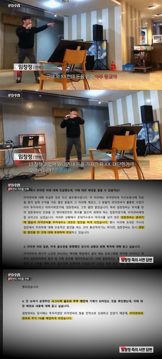 제작진은 임창정에게 직접 답변을 듣기 위해 소속사를 찾아갔지만 임창정의 모습은 볼 수 없었다. 임창정 측은 서면을 통해 "라덕연에 대해 언급한 것은 자선 골프행사다. 이 자리에는 라덕연의 자산운용사에 자금을 맡겨 실제 수익을 거둔 많은 분들이 있었고, 그 분들이 라덕연이 훌륭한 사업가이자 투자자라고 이야기했기에, 임창정도 그런 줄만 알았다"라고 설명했다.