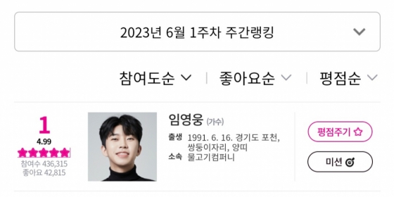 아이돌차트에 따르면 지난 6월 2일부터 6월 8일까지 집계된 평점랭킹에서 임영웅은 43만 6315표를 얻어 최다득표를 기록했다.