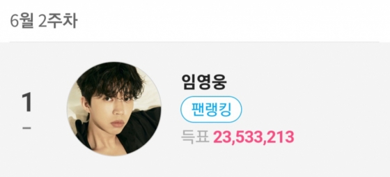 임영웅은 6월 2주차 팬앤스타 솔로 랭킹에서 2353만 3213표를 획득해 1위를 차지했다.