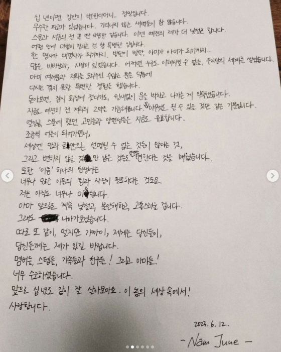 이와 함께 RM은 "멤버들, 스텝들, 가족들과 친구들! 그리고 아미들! 너무 수고하셨다. 앞으로 10년도 같이 잘 살아보아요. 이놈의 세상 속에서! 사랑합니다"라고 글을 맺었다.