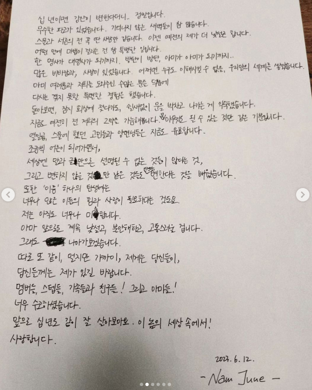 RM은 13일 팬 플랫폼 위버스와 자신의 인스타그램 등을 통해 올린 장문의 글을 직접 적은 손 편지로 공개했다.