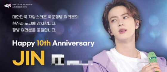 광고 속 진은 보라색 겉옷을 착용하고 있으며 "대한민국 자랑스러운 국군장병 여러분의 헌신과 노고에 감사합니다. 장병 여러분을 응원합니다. Happy 10th Anniversary JIN"이라는 문구가 적혀있다.