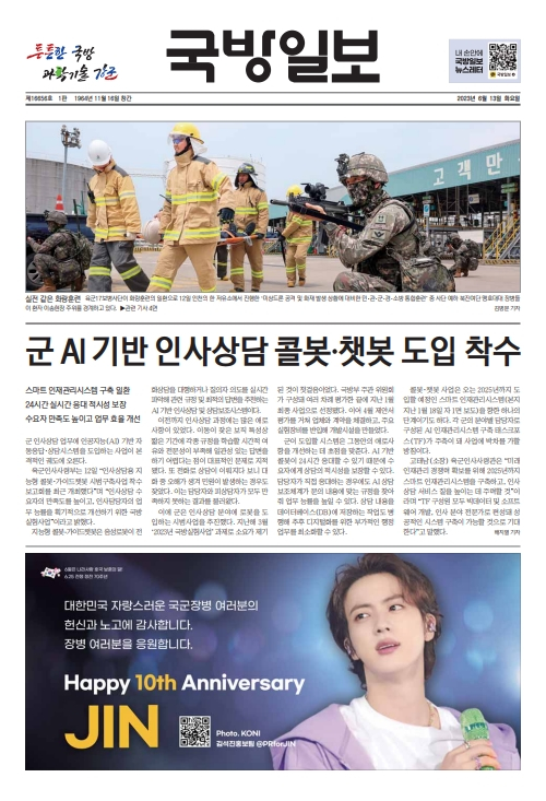 그룹 방탄소년단이 데뷔 10주년을 맞은 가운데 국방부에서 발행하는 국방일보의 1면이 화제다.