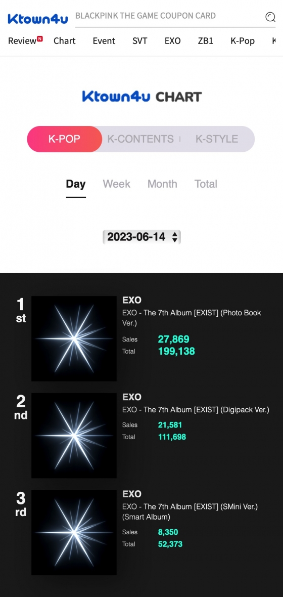 16일 K-POP 글로벌 온오프라인 통합 플랫폼 케이타운포유(Ktown4u)에 따르면 오는 7월 10일 발매되는 엑소의 정규 7집 'EXIST'는 최근 예약 판매 시작 3일 만에 선주문량이 35만장을 돌파했다.