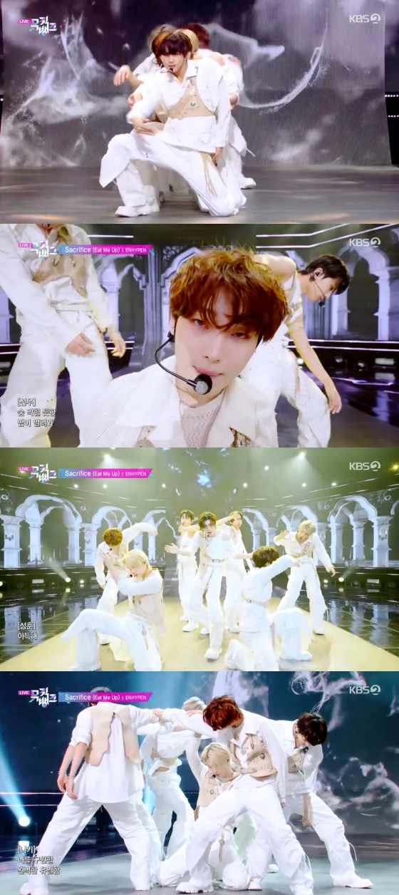 16일 오후 방송된 KBS 2TV 음악 프로그램 '뮤직뱅크'에는 엔하이픈(ENHYPEN) 미니 4집 'DARK BLOOD'의 후속곡 'Sacrifice (Eat Me Up)'무대가 담겼다.