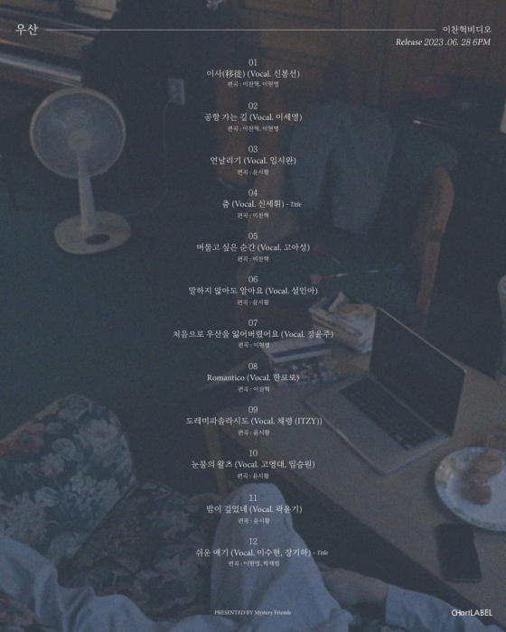 지난 16일 오후 이찬혁비디오의 소속사 차트레이블(CHart Label) 공식 SNS 채널을 통해 프로젝트 앨범 '우산'의 트랙리스트가 공개됐다.
