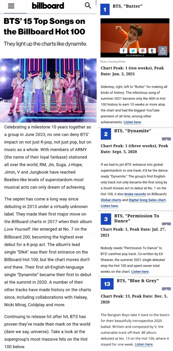 빌보드는 방탄소년단 데뷔 10주년을 기념하며 '핫 100' 차트에 오른 곡들 중에서 주간 실적을 기반으로 다양한 방법으로 방탄소년단 '톱송 15'를 선정했다.