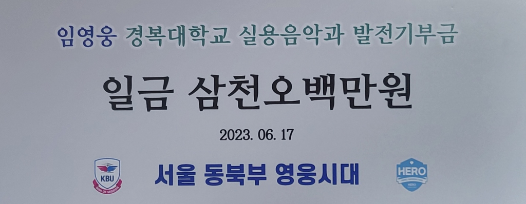 임영웅 팬클럽 '서울동북부영웅시대'는 임영웅의 33번째 생일을 기념해 6월 17일 경복대학교 실용음악학과에 3500만 원의 발전기부금을 전달했다.