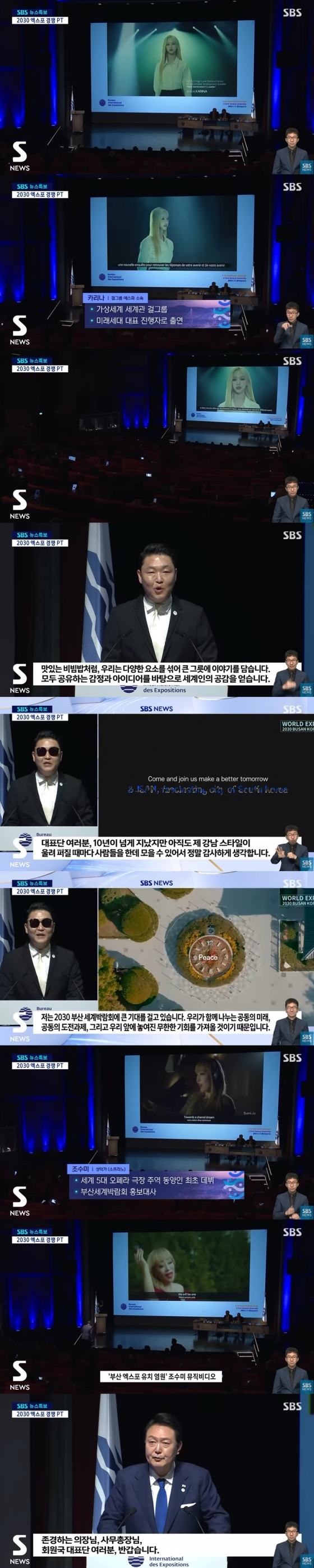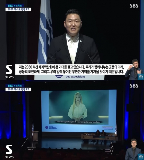 가수 싸이와 그룹 에스파 카리나가 세계박람회 부산 유치를 위한 경쟁 프레젠테이션에 등장해 K-팝의 위상을 드높였다.