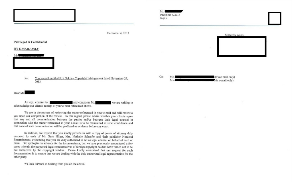 결국 21일 오전 아이유 소속사 이담엔터테인먼트는 2013년 로엔엔터테인먼트에서 변호사를 통해 노든 엔터테인먼트 퍼블리싱에 전달한 이메일 일부를 공개, "노든 엔터테인먼트로부터 전달받은 메일을 확인했으며, 이에 대한 답변 내용을 회신했다"라고 말했다.