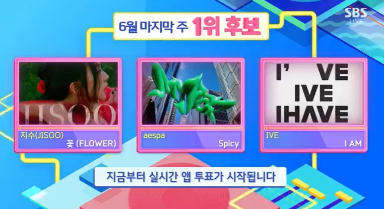 지수는 '꽃 (FLOWER)', 에스파는 'Spicy'(스파이시), 아이브는 'I AM'(아이 엠)으로 1위 후보가 됐다.