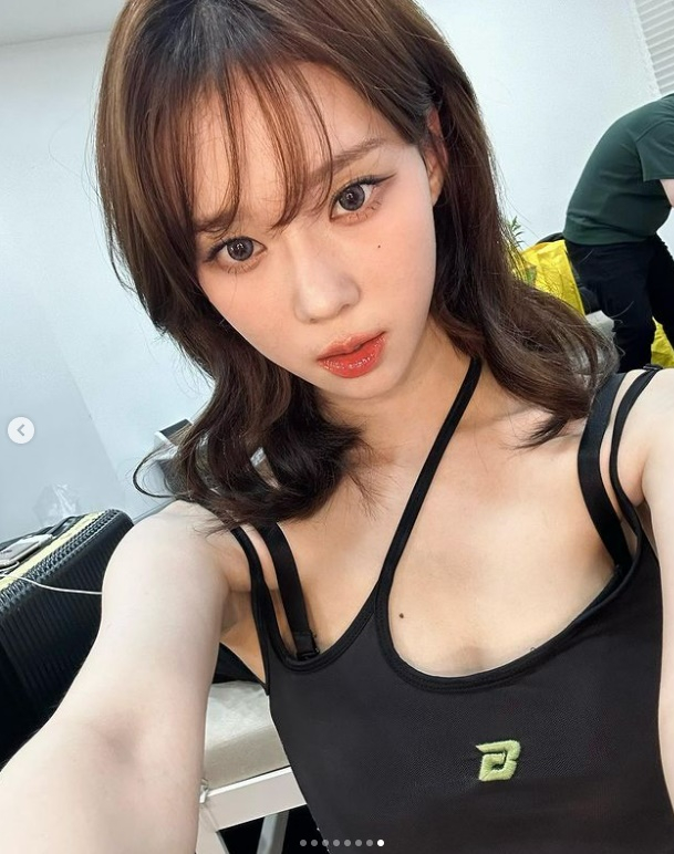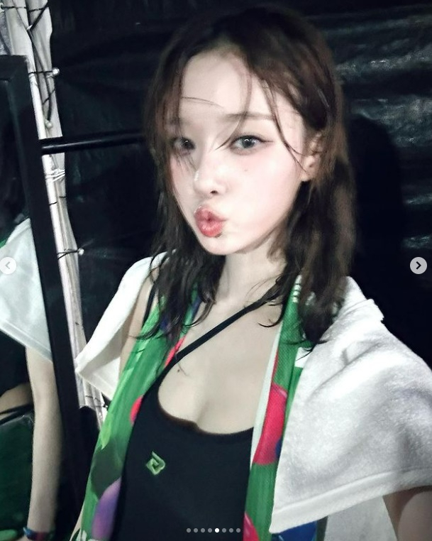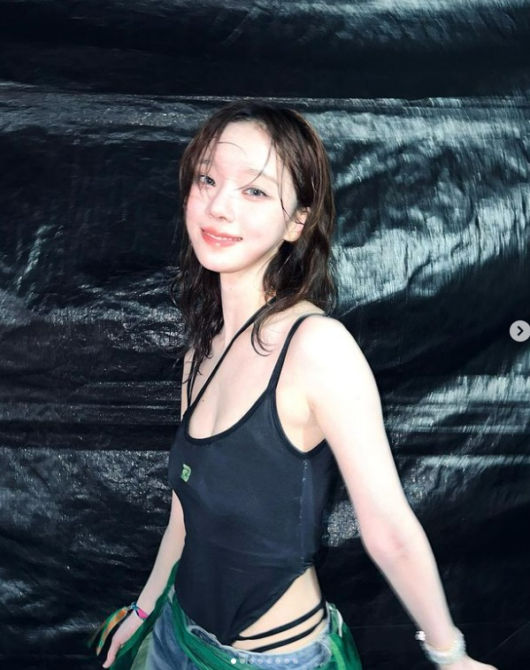 사진 속 윈터는 컷아웃 수영복 패션과 젖은 머리를 선보이며 이날 무대의 즐거운 여운을 전했다.
