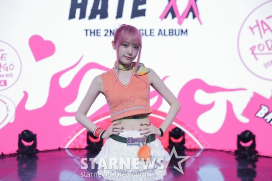 가수 최예나가 27일 오후 서울 용산구 한남동 블루스퀘어에서 진행된 두 번째 싱글 앨범 'HATE XX'(헤이트 엑스엑스) 발매 기념 쇼케이스에서 포즈를 취하고 있다.