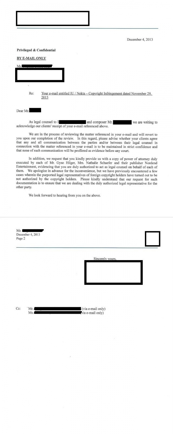 넥타와 프로젝트를 통해 음원 '히어스 어스'를 발매한 공식 음악 출판사 '노든 엔터테인먼트 퍼블리싱'(Nordend Entertainment Publishing)은 공식 홈페이지에 "당사나 넥타 측에 연락해 '저작권 침해' 문제를 명확하게 했다는 주장에 놀랐다. 이는 사실이 아니다. 현재까지 아이유나 로엔엔터테인먼트 또는 이담엔터테인먼트의 공식 대표자가 우리에게 연락을 한 적이 없다. 우리가 여러 차례 연락한 것에 대해 응답도 하지 않았다"라고 밝혔다.