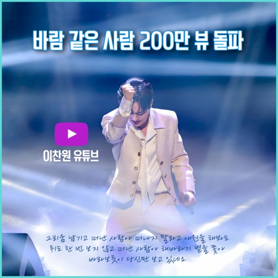 가수 이찬원의 '바람 같은 사람' 음원 영상이 200만 뷰를 달성하며 인기를 빛냈다.
