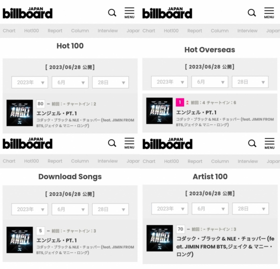 빌보드 재팬이 발표한 6월 28일 자 메인 싱글 차트 '핫 100'에서 지민이 참여한 할리우드 블록버스터 '분노의 질주10' 메인 테마곡 '엔젤 파트1'(Angel Pt.1)이 80위로 재진입에 성공했다.