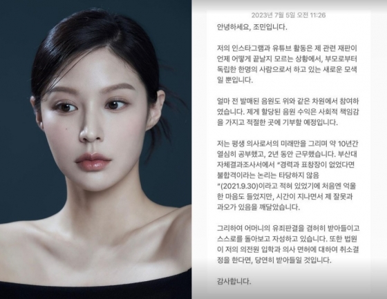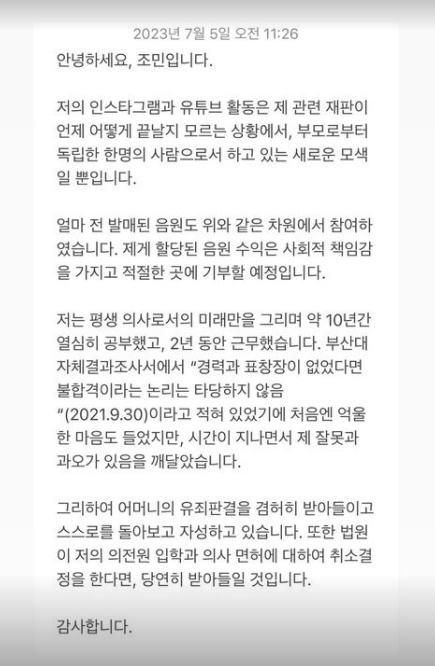 조민은 "어머니의 유죄 판결을 겸허히 받아들이고 스스로를 돌아보며 자성하고 있다"며 정경심 전 동양대 교수의 징역 4년 판결을 언급했다. 그는 오는 19일 진행되는 부산대 의학전문대학원 입학허가 취소에 대한 항소심 첫 변론을 앞둔 것에 "법원이 의전원 입학과 의사 면허에 대해 취소 결정을 내려도 당연히 받아들이겠다"는 입장을 보였다.