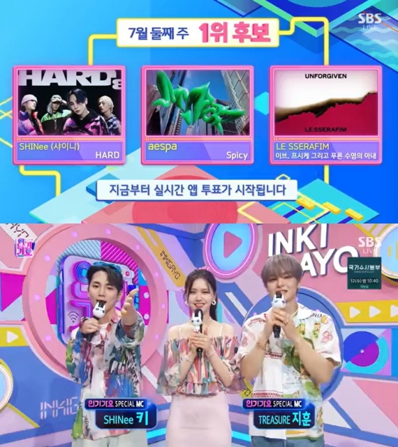 샤이니, 에스파, 르세라핌은 9일 오후 방송된 SBS 음악 프로그램 '인기가요'에서 7월 둘째 주 1위 후보에 올랐다.