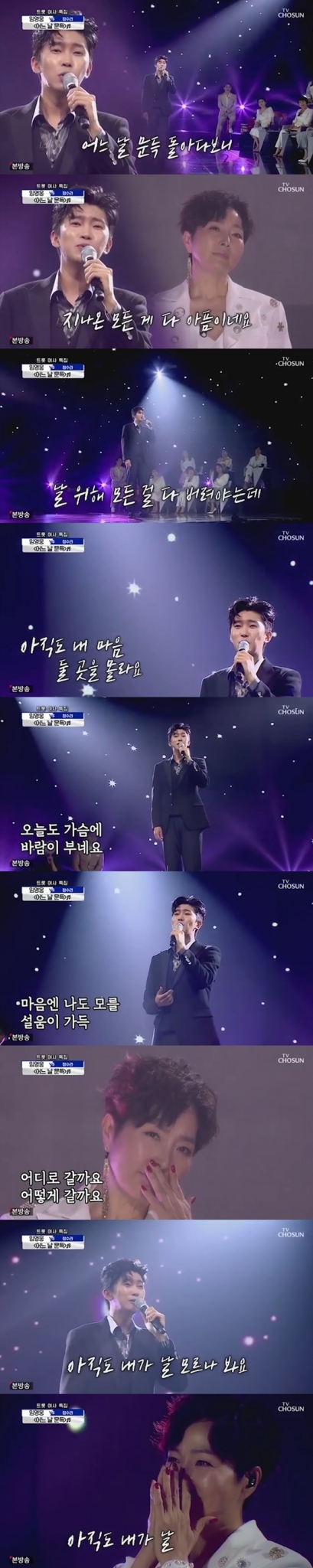 임영웅은 감미로운 목소리와 빼어난 가창력으로 감성 넘치는 무대를 선보였다. 이날 게스트로 출연한 '어느 날 문득' 원곡자 정수라는 촉촉한 눈빛으로 임영웅의 무대에 깊은 감동을 나타냈다.