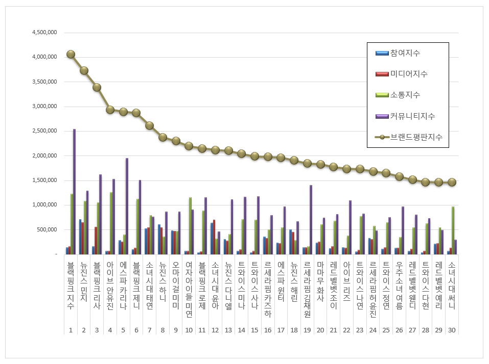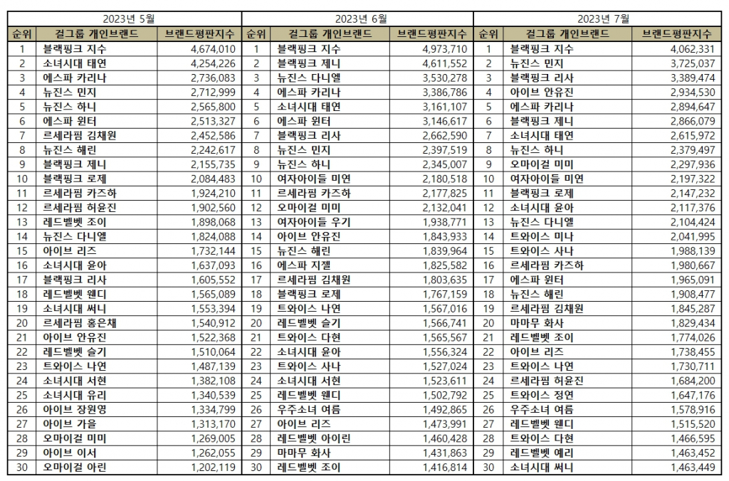 2023년 7월 걸그룹 개인 브랜드평판 30위 순위는 블랙핑크 지수, 뉴진스 민지, 블랙핑크 리사, 아이브 안유진, 에스파 카리나, 블랙핑크 제니, 소녀시대 태연, 뉴진스 하니, 오마이걸 미미, 여자아이들 미연, 블랙핑크 로제, 소녀시대 윤아, 뉴진스 다니엘, 트와이스 미나, 트와이스 사나, 르세라핌 카즈하, 에스파 윈터, 뉴진스 해린, 르세라핌 김채원, 마마무 화사, 레드벨벳 조이, 아이브 리즈, 트와이스 나연, 르세라핌 허윤진, 트와이스 정연, 우주소녀 여름, 레드벨벳 웬디, 트와이스 다현, 레드벨벳 예리, 소녀시대 써니 순으로 분석됐다.