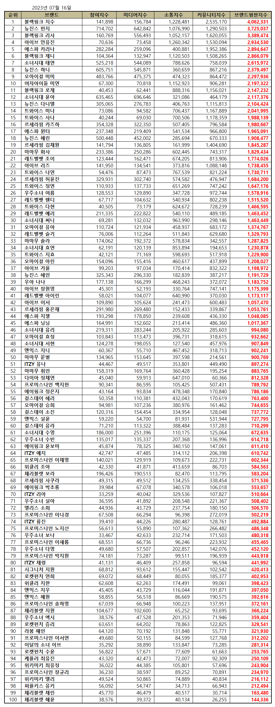 2023년 7월 걸그룹 개인 브랜드평판 100위 브랜드는 블랙핑크 지수, 뉴진스 민지, 블랙핑크 리사, 아이브 안유진, 에스파 카리나, 블랙핑크 제니, 소녀시대 태연, 뉴진스 하니, 오마이걸 미미, 여자아이들 미연, 블랙핑크 로제, 소녀시대 윤아, 뉴진스 다니엘, 트와이스 미나, 트와이스 사나, 르세라핌 카즈하, 에스파 윈터, 뉴진스 해린, 르세라핌 김채원, 마마무 화사, 레드벨벳 조이, 아이브 리즈, 트와이스 나연, 르세라핌 허윤진, 트와이스 정연, 우주소녀 여름, 레드벨벳 웬디, 트와이스 다현, 레드벨벳 예리, 소녀시대 써니, 오마이걸 유아, 레드벨벳 슬기, 마마무 솔라, 소녀시대 효연, 트와이스 지효, 오마이걸 아린, 아이브 가을, 뉴진스 혜인, 우아 나나, 아이브 장원영, 레드벨벳 아이린, 아이브 이서, 르세라핌 홍은채, 에스파 지젤, 에스파 닝닝, 소녀시대 유리, 오마이걸 효정, 소녀시대 서현, 엔믹스 지니, 마마무 문별, ITZY 유나, 마마무 휘인, 다이아 정채연, 프로미스나인 백지헌, 에이핑크 정은지, 걸스데이 혜리, 오마이걸 승희, 걸스데이 소진, 엔믹스 설윤, 걸스데이 유라, 소녀시대 수영, 우주소녀 수빈, 에이핑크 윤보미, ITZY 예지, 프로미스나인 이채영, 위클리 조아, 체리블렛 보라, 르세라핌 사쿠라, 에이핑크 박초롱, ITZY 리아, 우주소녀 설아, 엘리스 소희, 프로미스나인 이나경, ITZY 류진, 프로미스나인 노지선, 우주소녀 보나, 프로미스나인 이새롬, 우주소녀 다영, 프로미스나인 박지원, ITZY 채령, 시그니처 지원, 로켓펀치 연희, 위클리 지한, 엔믹스 지우, 엔믹스 해원, 프로미스나인 송하영, 체리블렛 지원, 우주소녀 엑시, 로켓펀치 쥬리, 라붐 해인, 프로미스나인 이서연, 이달의 소녀 이브, 로켓펀치 수윤, 케플러 최유진, 위키미키 최유정, 프로미스나인 장규리, 위키미키 엘리, 퍼플키스 유키, 체리블렛 채린, 체리블렛 해윤 순으로 분석됐다.