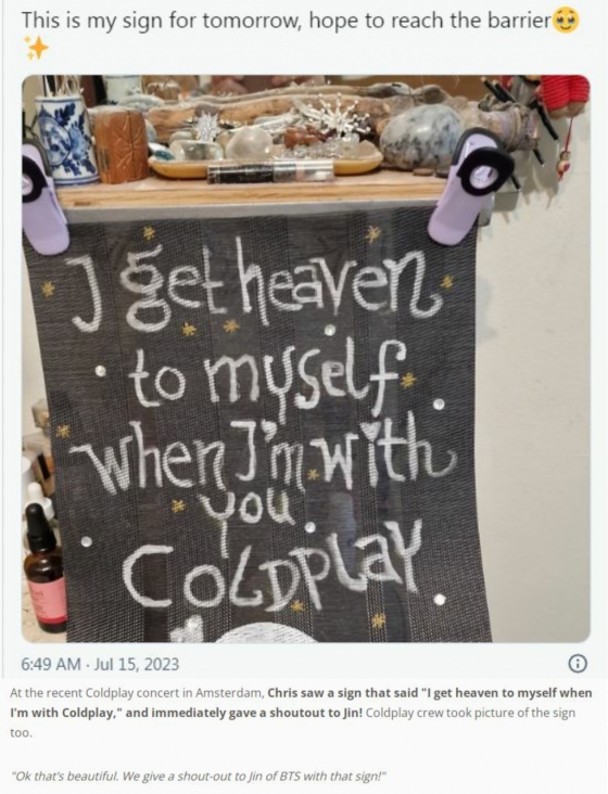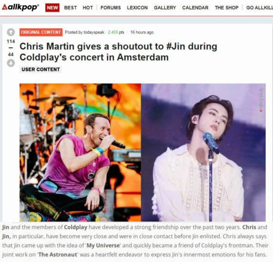 미국 연예매체 올케이팝(Allkpop)은 '암스테르담 콜드플레이 콘서트 도중 진에게 감사의 인사를 전한 크리스마틴'이라는 제목의 기사를 통해 소식을 전했다.