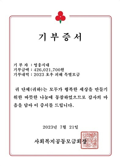 임영웅 팬클럽 '영웅시대'는 7월 17일 오후부터 7월 20일 자정까지 해피빈을 통해 4억 2602만 1700원을 모금, 수해 복구 성금으로 기부했다.