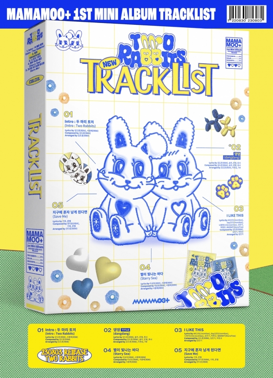 마마무+(솔라, 문별)는 22일 0시 공식 SNS에 미니 1집 'TWO RABBITS'(투 래빗츠)의 트랙리스트 이미지를 게재했다. 이에 따르면, 신보에는 타이틀곡 '댕댕 (dangdang)'을 포함해 'Intro : 두 마리 토끼 (Intro : Two Rabbits)', 'I LIKE THIS', '별이 빛나는 바다 (Starry Sea)', '지구에 혼자 남게 된다면 (Save Me)' 등 총 5곡이 수록됐다.