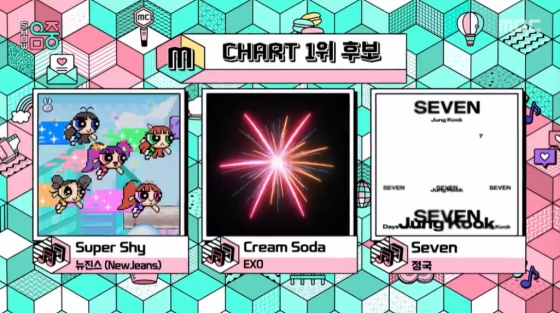 이날 뉴진스는 'Super Shy', 엑소는 'Cream Soda', 정국은 'Seven'으로 '음중' 1위 후보에 이름을 올렸다. 과연 세 아티스트 중 누가 '음중' 1위 트로피를 품에 안을지 글로벌 K팝 팬들의 관심이 뜨겁다.
