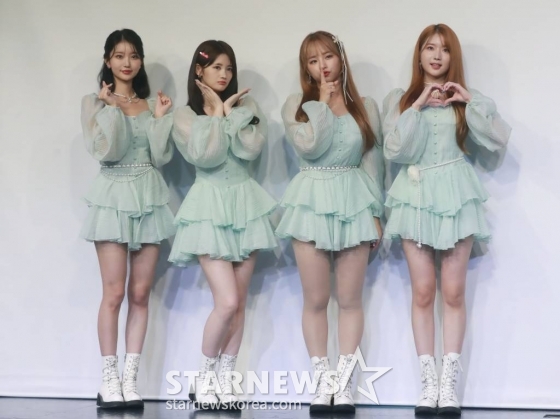 걸그룹 세러데이(SATURDAY)가 27일 오전 서울 마포구 유형빈 소극장에서 진행된 여섯 번째 싱글 ‘Find Summer’ 발매기념 쇼케이스에서 포즈를 취하고 있다. /2023.07.27 /사진=이동훈 기자 photoguy@