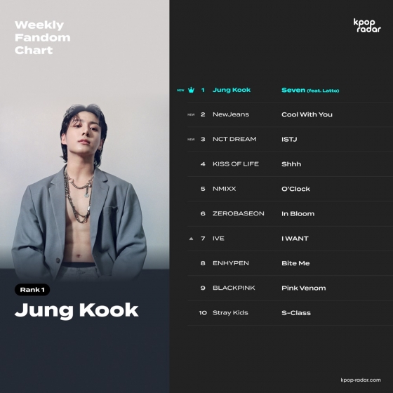 이번 주 '케이팝레이더'에서 발표된 위클리 팬덤 차트의 TOP 10에는 대세 걸그룹 뉴진스(NewJeans)의 '쿨 위드 유(Cooll With You)'가 2위, NCT 드림(NCT DREAM)의 '아이에스티제이(ISTJ)가 3위에 올랐다. 또한 아이브(IVE)가 발매한 펩시와의 컬래보 곡인 '아이 원트(I WANT)'가 7위 자리를 차지했다.