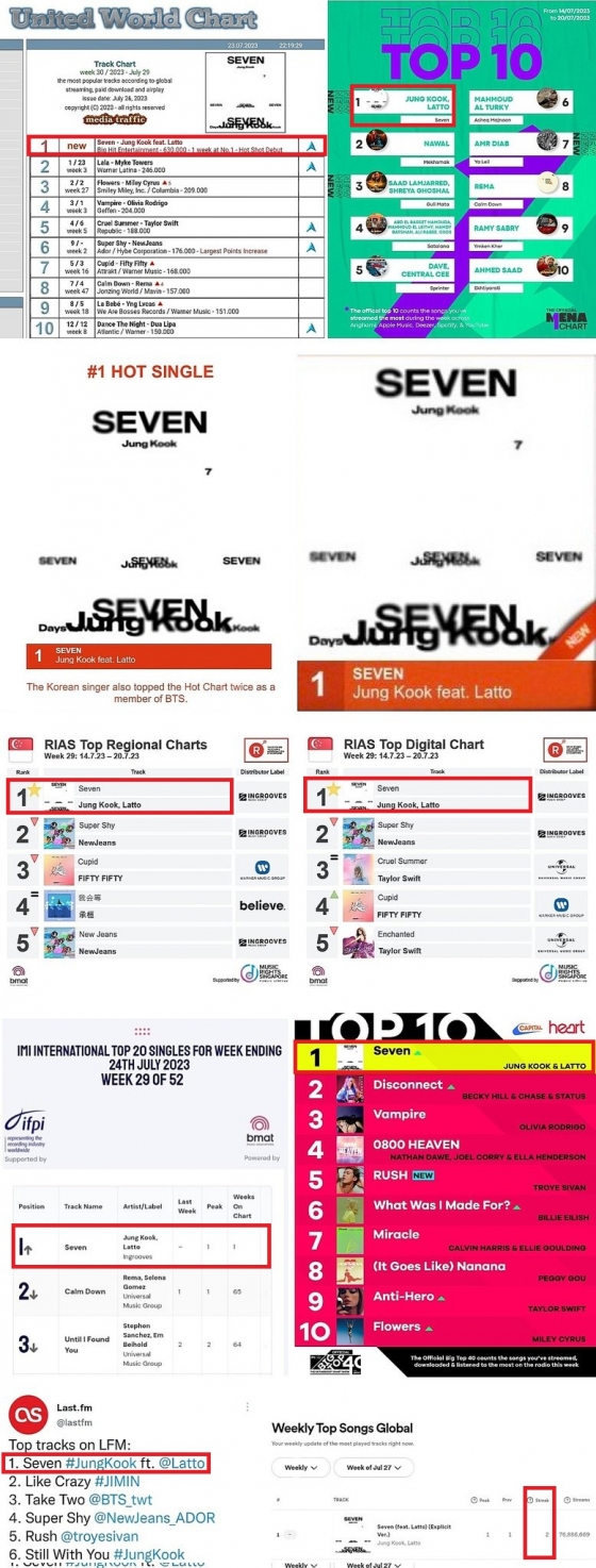 또 정국의 'Seven'은 국제 음반 산업 협회(IFPI)의 중동 및 북아프리카 최초의 공식 차트 오피셜 MENA 주간 차트 1위, 뉴질랜드 핫 40 싱글 차트 1위로 K팝 솔로 가수 최고 순위 데뷔, 오피셜 싱글 차트 2위로 한국 가수 최고 순위 데뷔를 기록하는 저력도 보여줬다.
