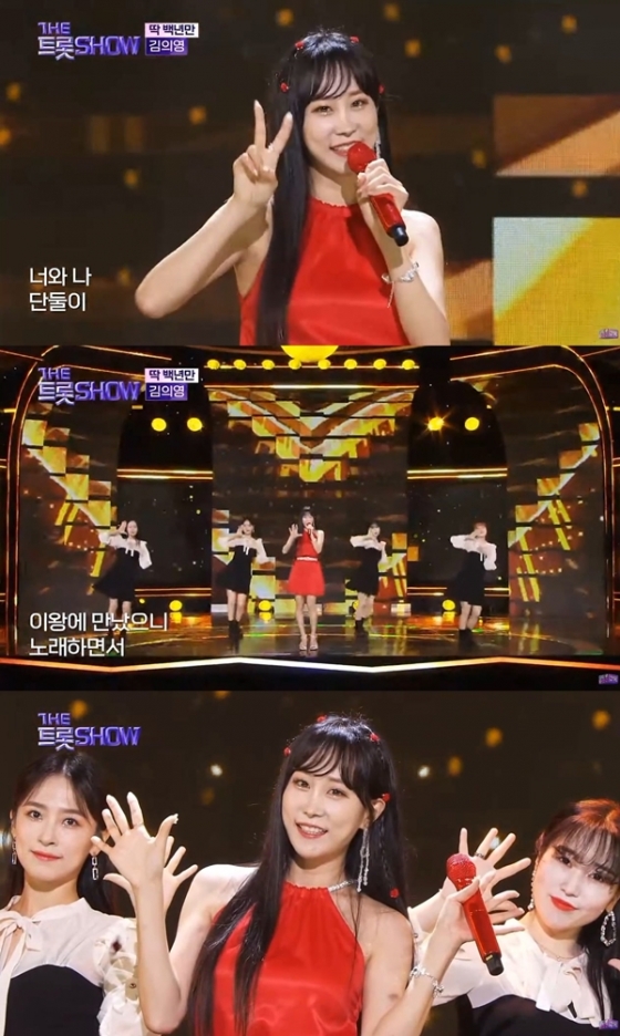 김의영은 지난 7월 31일 방송된 SBS M '더트롯쇼'에 출연해 자신의 곡 '딱 백년만'의 무대를 펼쳤다. 김의영은 어깨 라인을 시원하게 드러낸 레드 톤의 원피스와 화려한 액세서리와 붉은 장미꽃을 연상케하는 화사하면서도 강렬한 비주얼로 시선을 사로잡았다.
