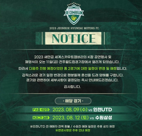 전북 현대는 "2023 새만금 세계스카우트잼버리의 K팝 공연행사와 폐영식이 오는 11일 전주월드컵경기장에서 열리게 됐다. 따라서 다음 주 열릴 예정이던 전북의 홈 2경기에 대한 일정이 변경된다"고 밝혔다.