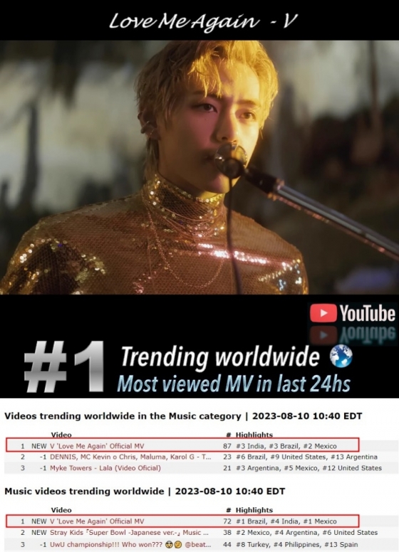 방탄소년단(BTS) 뷔의 뮤직비디오가 전 세계적으로 뜨거운 반향을 일으키며 글로벌 뮤직비디오 차트를 점령했다.