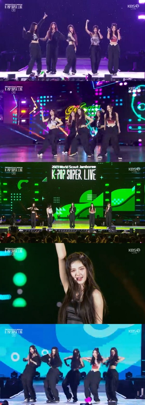 11일 KBS 2TV에서 '잼버리 K팝 슈퍼라이브 콘서트'(이하 K팝 슈퍼라이브'가 생중계됐다. 이날 1부 마지막 가수로 무대에 오른 뉴진스는 비가 오는 상황에서도 산뜻한 미소로 에너지 가득한 무대를 펼쳤다.