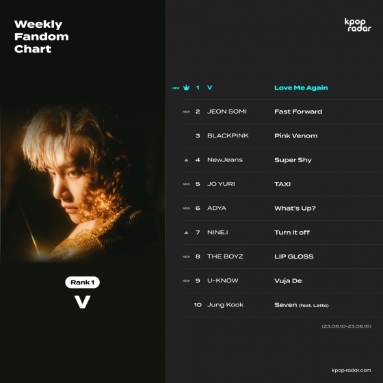 이번주 차트에서는 뷔의 첫 솔로 앨범 '레이오버'(Layover) 선공개 곡 '러브 미 어게인'(Love Me Again)이 1위 자리를 차지했다.