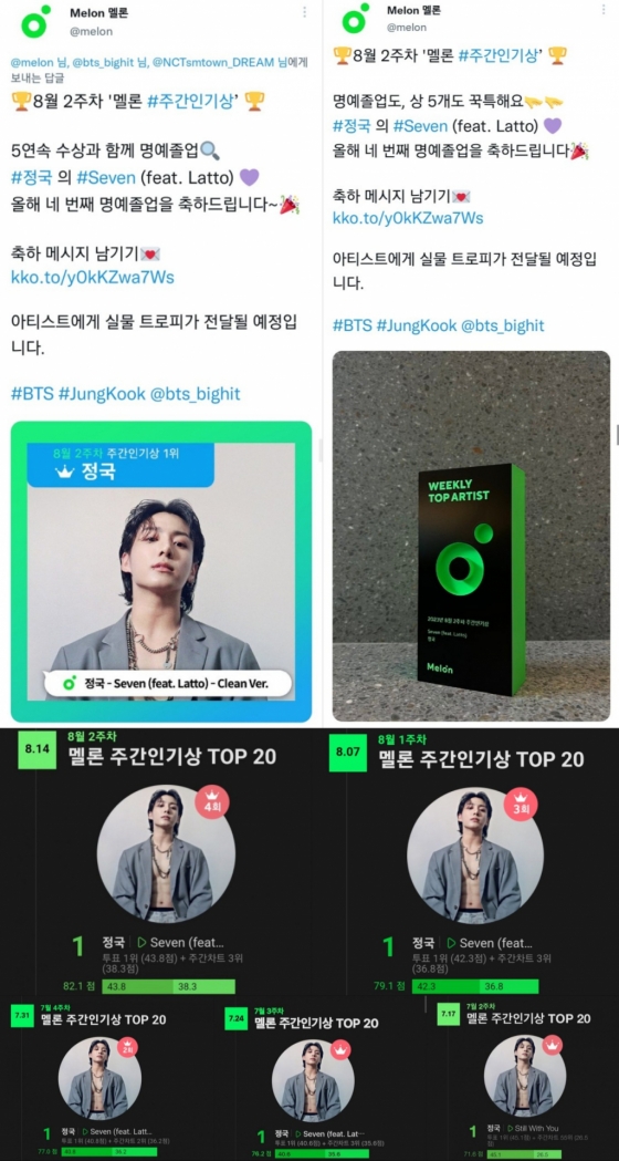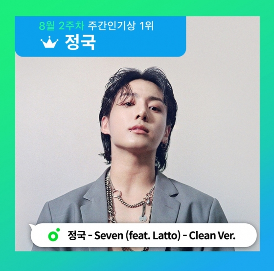 정국은 솔로 싱글 'Seven'(세븐)으로 8월 2주차 멜론 주간 인기상 TOP 20에서 1위를 차지했다. 'Seven'은 투표 1위(43.8점), 주간 차트 3위(38.3점)로 합산 82.1점을 기록하며 왕좌에 올랐다.