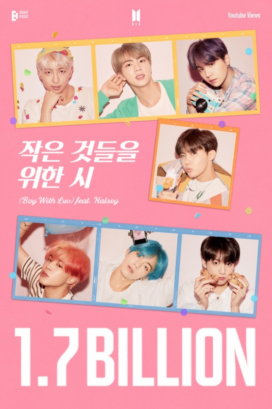 톱 아이돌그룹 방탄소년단(BTS, RM 진 지민 제이홉 슈가 뷔 정국) 히트곡 '작은 것들을 위한 시'(Boy With Luv)(Feat. Halsey) 뮤직비디오가 17억뷰 대열에 올랐다.