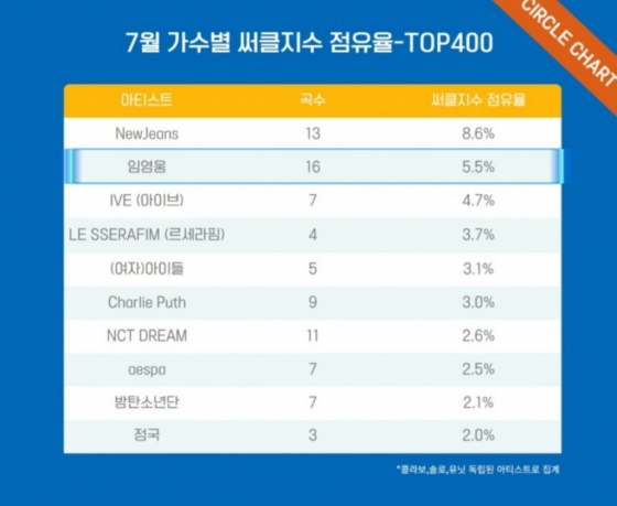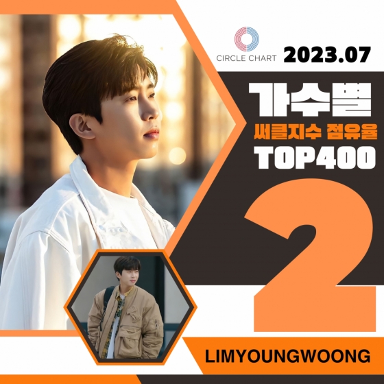 임영웅은 써클차트가 발표한 7월 가수별 써클지수 점유율 TOP400에서 합산 점유율 5.5%를 기록, 2위를 차지했다.